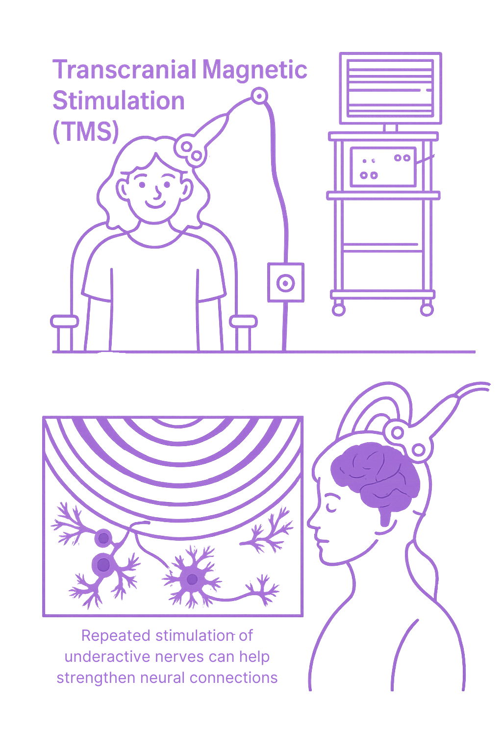 TMS uses magnetic pulses to stimulate parts of the brain that aren’t functioning at their usual level. Over time, this repeated stimulation encourages the brain to rewire itself by strengthening the connections between nearby neurons—a process called neuroplasticity.